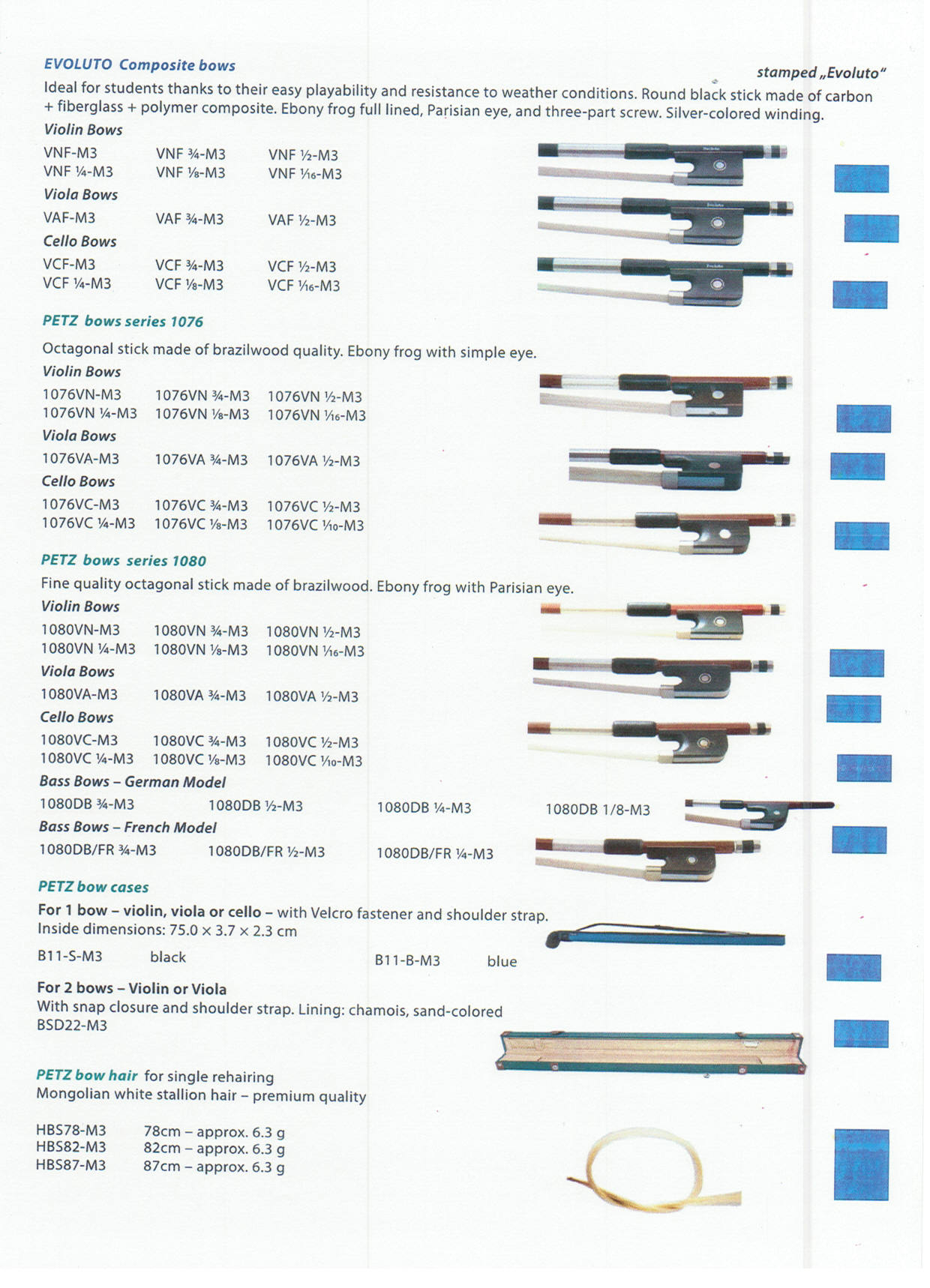 A page of bows in both a composite carbon material as well as traditional brazilwood. Also a bow case and bow hair avaialble. For this product you can see a full range of bow hair and cases on the GDfV&A full service tab