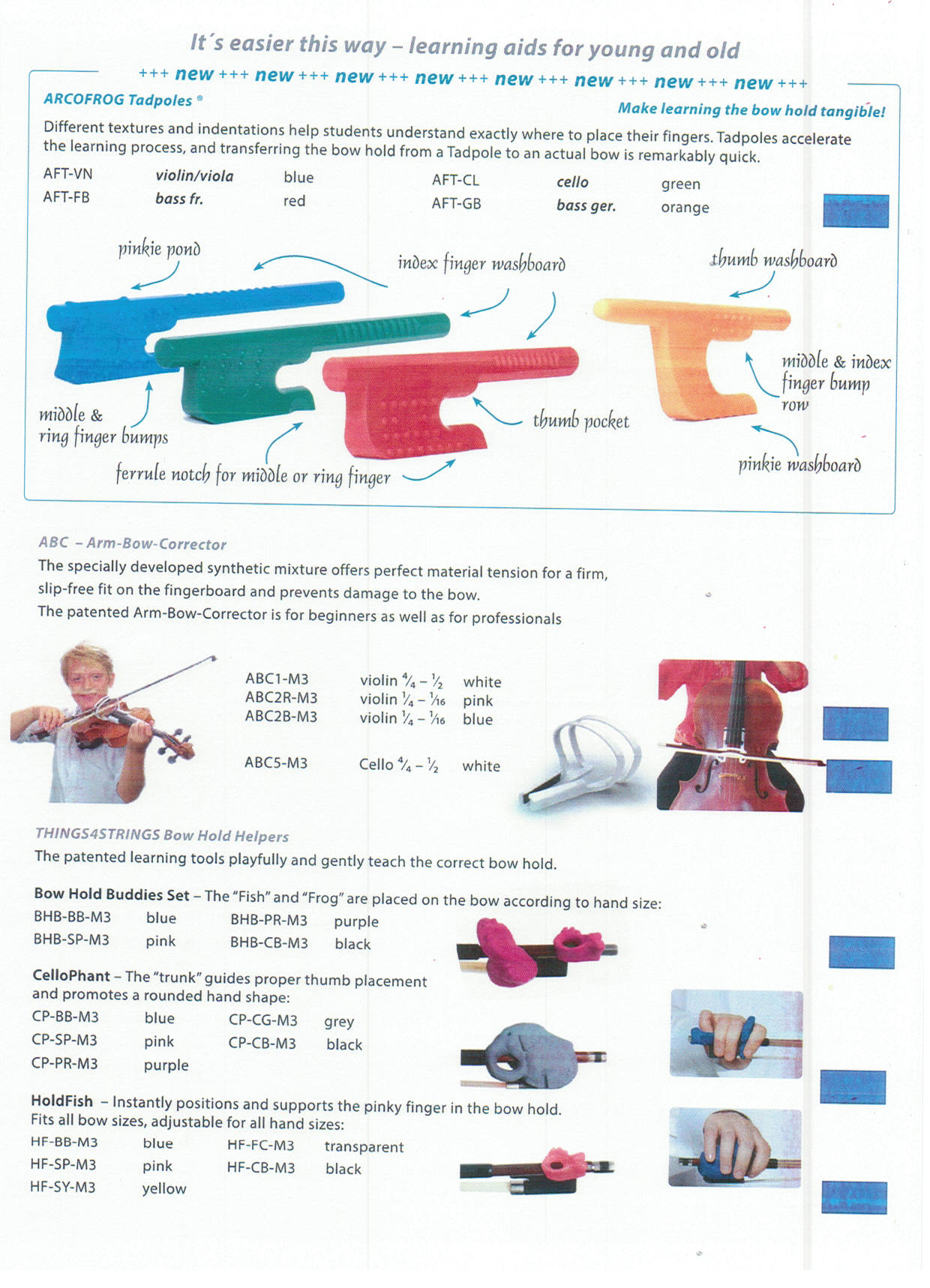 Bow aids for the younger ones - Holdfish, Cellophant, Bow Hold Buddy and ARCOFROG a new over cover to the bow's frog to help them know how to hold their bow better as they learn.
